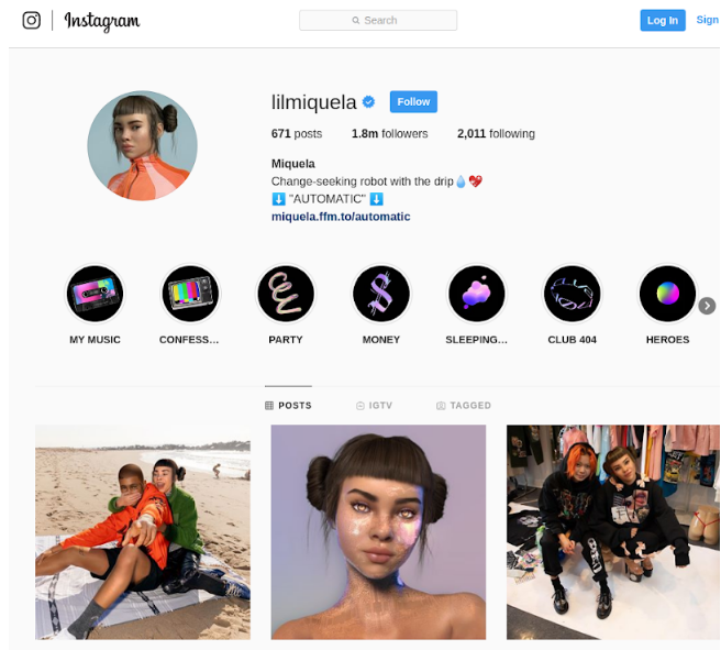 Lil Miquela and other Virtual Avatars. Lil Miquela is the world’s most popular virtual influencer withs 1.8 million followers on Instagram. She shoots ads for brands like Calvin Klein and Loreal, has appeared in videos with Bella Hadid and J Balvin (who are real celebrities), and she also has her own music videos. However, she is not real. Lil Miquela is a 3D model created by a team of virtual effects artists from Brud. Virtual influencers like her (it?) have become extremely famous and will continue to rise in popularity.