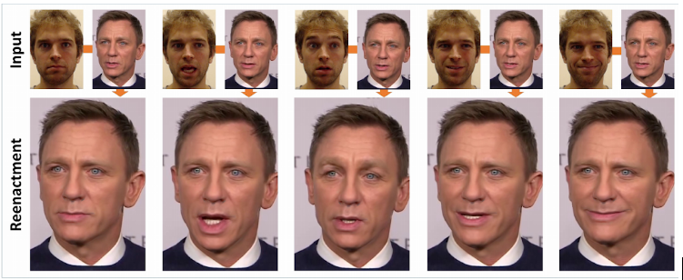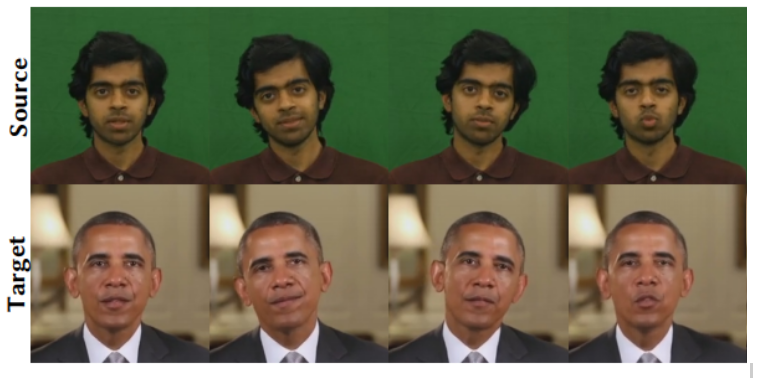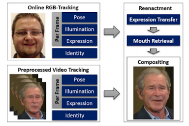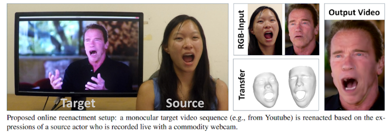 Facial reenactment has been an interest of the Computer Vision community for quite some time, and was commonly achieved using RDB-D sensors (Like Kinect) or using a marker setup. This paper from TUM’s Visual Computing group in 2016 was the first to perform real-time facial reenactment of monocular target video (e.g., Youtube video) using a source sequence which is also a monocular video stream, captured live with a commodity webcam. The goal was to animate the facial expressions of the target video by a source actor and re-render the manipulated output video in a photo-realistic fashion.