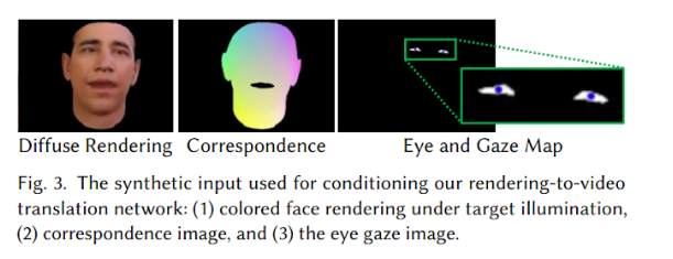 In the next step they generate new synthetic renderings of the target actor based on the modified parameters. Three different conditioning inputs are generated: a color rendering, a correspondence image, and an eye gaze image.