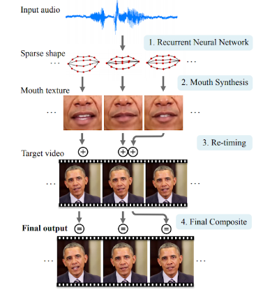 - Given an audio of Obama, audio features are extracted to use as input to a recurrent neural network that outputs, for every output video frame, a sparse mouth shape