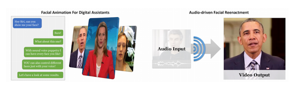 Facial Animation from text or speech is basically controlling a face using text or speech. Strictly speaking this falls under Facial Reenactment, but for the sake of simplicity I’ve divided it into categories based on what the source driver is - The source can be a video of a source actor (or) in this case audio.