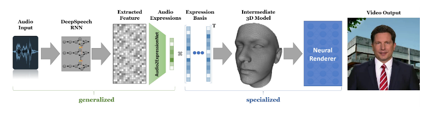 The Neural Voice Puppetry pipeline consists of two main parts - A generalized Network and a specialized network.
