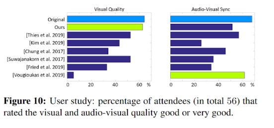 This is an interesting paper that made waves in the community back in 2018. They are the first to transfer the full 3D head pose, face expression, eye gaze and eye blinking, as compared to other approaches that were restricted to manipulations of facial expressions. They were also the first to synthesize photo-realistic videos of the target person’s upper body, including realistic clothing and hair. (A video portrait is a video with a person’s head and upper body). The core of this approach is a generative neural network with a novel space-time architecture. (Anything space-time deals with video data since a video is essentially images over time). The network takes as input synthetic renderings of a parametric face model, based on which it predicts photo-realistic video frames for a given target actor.
