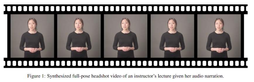 This is a very interesting paper from Udacity AI that generates photo-realistic videos of an Instructor from audio. Instructor-produced lecture videos are very popular in MOOCs, but shooting a video requires considerable resources and processes (i.e., instructor, studio, equipment, and production staff) and takes a lot of time. What if we can generate a new Lecture video from existing footage, driven by text or audio? This will make video production very agile and there is no need to re-shoot each new video