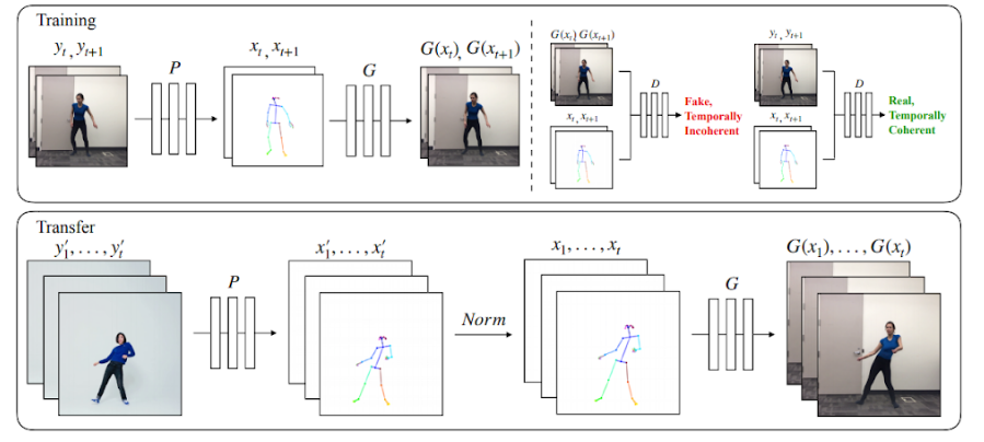 Training - The model uses a pose detector P to create pose stick figures from video frames of the target subject. The mapping G is learnt alongside an adversarial discriminator D which attempts to distinguish between the “real” correspondences (xt, xt+1),(yt, yt+1) and the “fake” sequence (xt, xt+1),(G(xt), G(xt+1)) .Transfer - A pose detector P is used to obtain pose joints for the source person that are transformed by the normalization process (Norm) into joints for the target person for which pose stick figures are created. Then the trained mapping G is applied.
