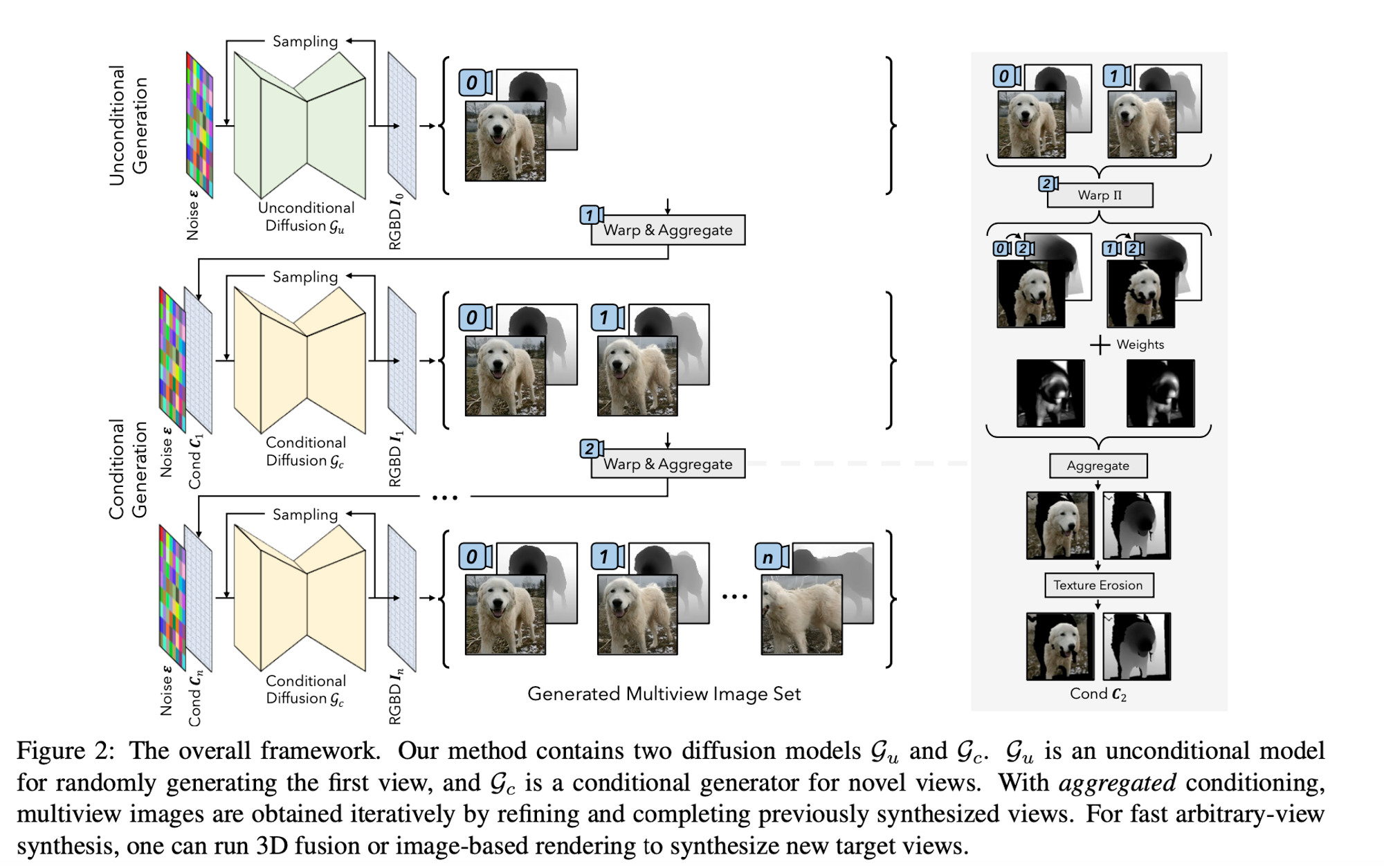Once the conditional and unconditional diffusion models have been trained we can go ahead and sample multi-view images. The first step is to define the sequence of camera poses that covers the desired views for multi-view synthesis. Given this camera sequence, novel views are generated sequentially with previously sampled images as conditions. In order to ensure that the current condition incorporates previous samples they use aggregated sampling. Aggregated conditioning collects information from previous images by performing a weighted sum across all warped versions of the previous images.