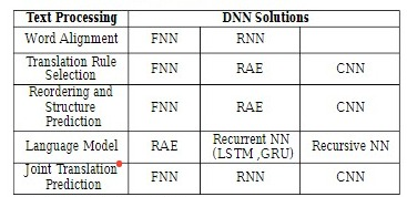 Suitable DNN solutions are used for processes, such as word alignment, reordering rules, language modeling, and join translation prediction to translate sentences without using a large database of rules.