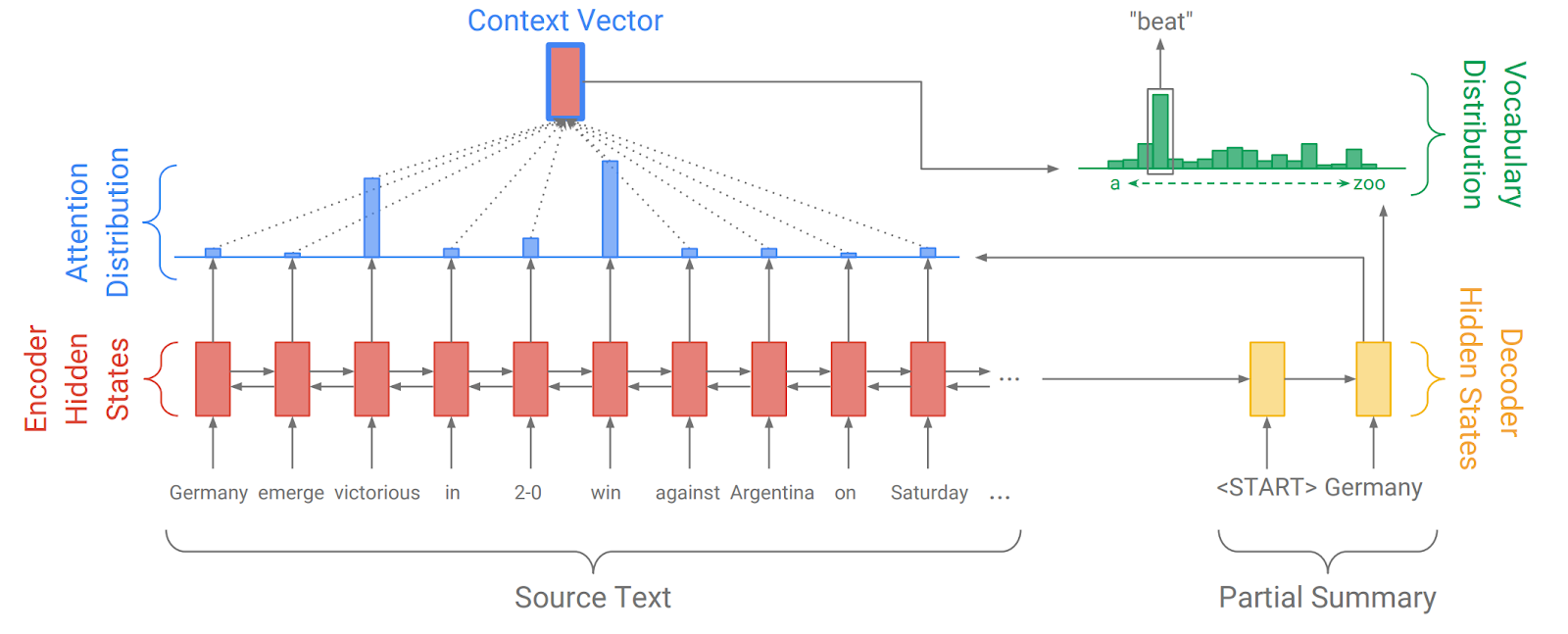 The increasing volume of data available today is making the role of document summarization critical. The latest advances in sequence-to-sequence models have made it easy for DL experts to develop good text summarization models. The two types of document summarization, namely extractive and abstractive summarization can be achieved through the sequence-to-sequence model with attention. Refer the diagram below from the Pointer Generator blog by Abigail See.