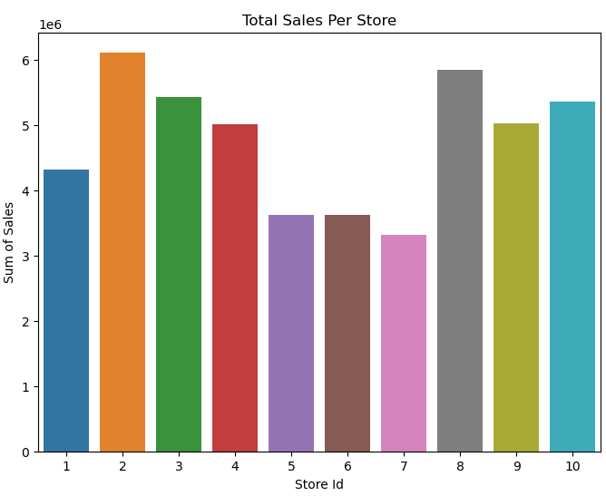 ax.set(xlabel = "Store Id", ylabel = "Sum of Sales", title = "Total Sales Per Store")