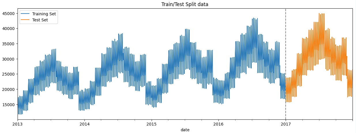train_dt_sales.head()DataFrame is split into two parts: the training set (train) and the test set (test). In this case, all data before January 1, 2017, is considered the training set, while data from and after January 1, 2017, is considered the test set.