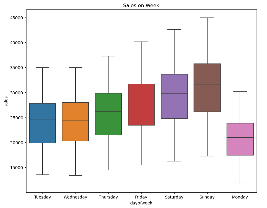 Sales typically exhibit an upward trend starting from Friday, reach their peak on Sunday, and then experience a decline on Monday. This pattern is influenced by the increased sales that commonly occur over the weekends.