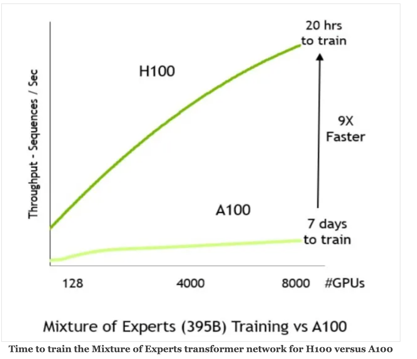 - When training the Mixture of Experts Transformer model with 395 billion parameters on 8,000 GPUs, Nvidia said rather than taking seven days using A100s, training on H100s takes only 20 hours.-NVIDIA