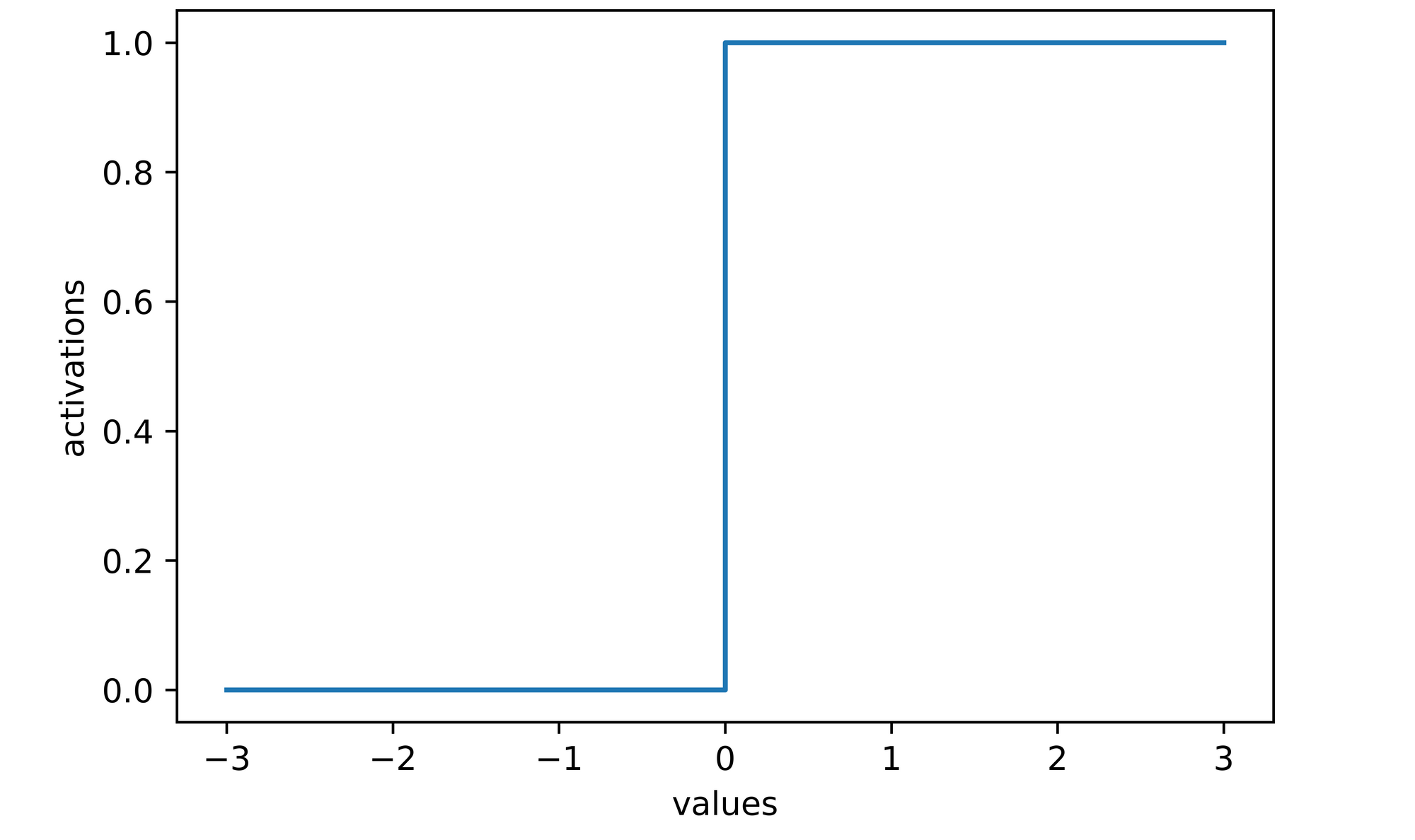 The binary step activation function defines a threshold for switching on or switching off neurons. It basically compares neuron values with the predefined threshold and only activates them if they are greater than or equal to the threshold value.
