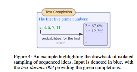 A simple illustration is found in Fig. 4. When evaluated independently, the second-most probable token for our inaugural number is ‘1’—not qualifying as prime. But, when generation remains unbroken, the derived sequence is correct.