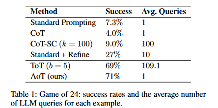 - Remarkably, AoT achieves its results with just a single query. Despite reducing the number of requests by more than a factor of 100, AoT still outperforms ToT in this task