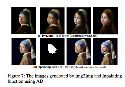 AD capabilities, including Image to Image (Img2Img) and Inpainting, are shown in Figure 7. The Inpaint and Image-to-Image tools are available in AD.