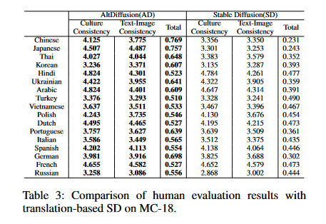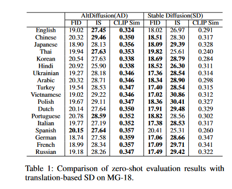 The table1 shows the outcomes of zero-shot evaluations of Stable Diffusion (SD) translations on the Multilingual-General-18 (MG-18) dataset.