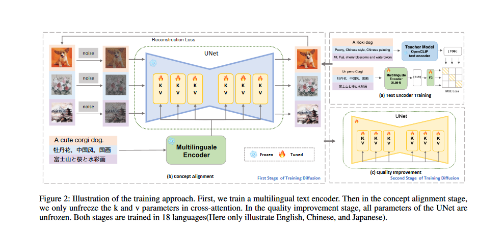 After training the text encoder, its parameters are then frozen and put into a pre-trained English-only off-the-shelf diffusion model. The authors make use of a two-stage training schema, which includes concept alignment and quality improvement stage, in order to turn a diffusion model that was previously only available in English into one that is multi-lingual.