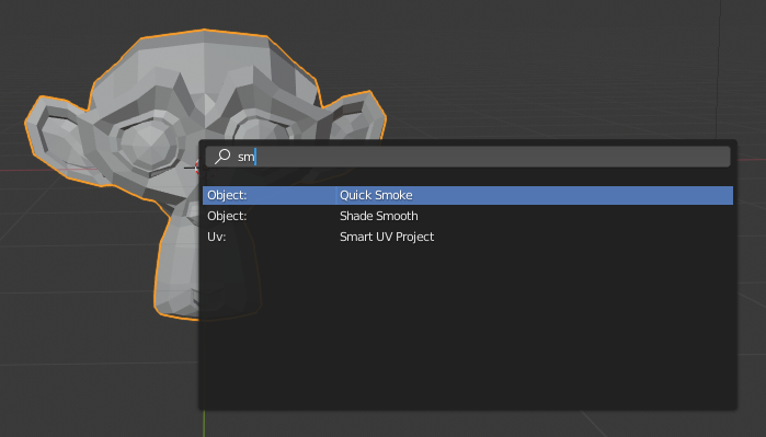 Our next step is to add the quick smoke object, which is already available pre-built in the Blender environment. To add the quick smoke animation, select the monkey mesh if you haven't already and click on the F3 button on the keyboard. Pressing the F3 button prompts the user with a bunch of options and a search button for making the required selective search. You can type in smoke as shown in the below image, and you will find the first option that shows the option of quick smoke that is available for the users to select. Select the first option, and you will now have the quick smoke activated.