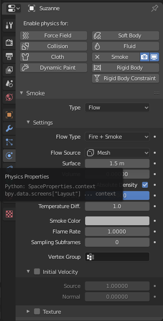 For the final step of this section of the article, we will complete the animation of the monkey mesh and ensure that we are able to light it on fire. Once you have the monkey mesh selected, ensure that you select the physics properties on the properties menu bar to the right side of the screen. The image provided below shows the representation of all the steps that must be followed in order to achieve the required results. Once you click on the physics properties, notice the type function under the smoke column and make sure to set it to Flow. The "Type" functionality might be domain by default sometimes.