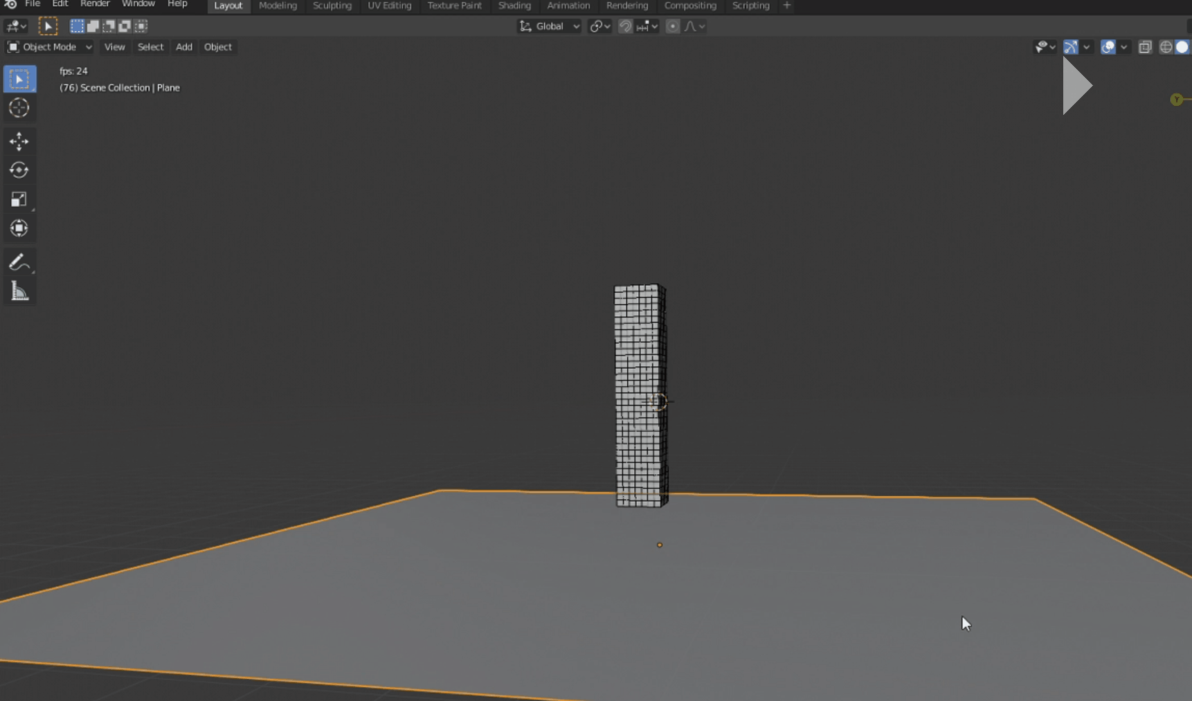 Once we have the base structure set up, we can proceed to construct the block of cubes above the plane mesh. The idea is as soon as we start the animation, the group of blocks will fall from a distance from the initial surface, and upon impact on the transfixed base, the group of blocks will crumble one by one accordingly. To create these blocks and design each of them separately might be a complex process to build from scratch. Hence, we will make use of the Python scripting option that is available in Blender for performing the following task. Open the text editor layout as discussed in our previous articles. You can choose to give the following code snippet any name that you desire but just make sure that the name ends with a ".py" label indicating that the file created is a Python file.