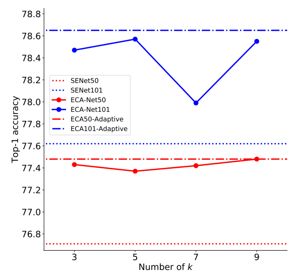 Although the kernel size in ECA-block is defined by the adaptive function ψ(C), the authors throughout all experiments fixed the kernel size k to be 3. The reason behind this is not clear and hasn't been accurately addressed by the authors when this concern was raised by GitHub users on their official code repository in this issue.
