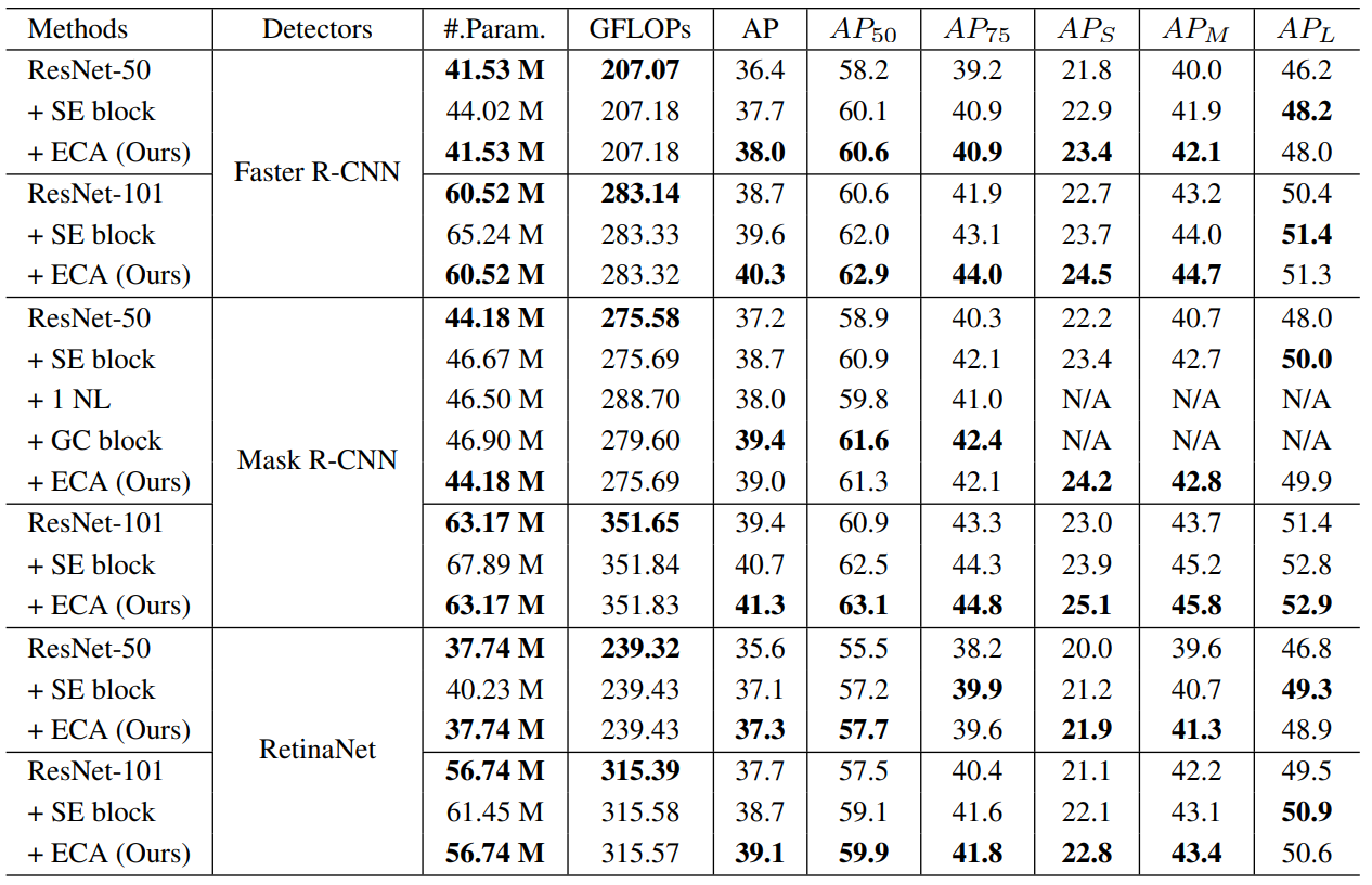 The authors perform ablation studies to observe the performance of each SE variant and compared it to the performance of ECA-block and as shown in the table below, ECA-block performs the best with the least parameter overhead. The authors also confirm the importance of channel attention because of the incremental performance obtained by SE-Var1 which contains no learnable parameters.