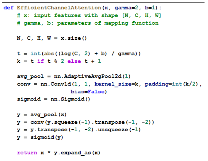 Additionally, as per the paper, the authors provide a PyTorch code snippet of ECA-block containing the adaptive function ψ(C) for computing the kernel size:
