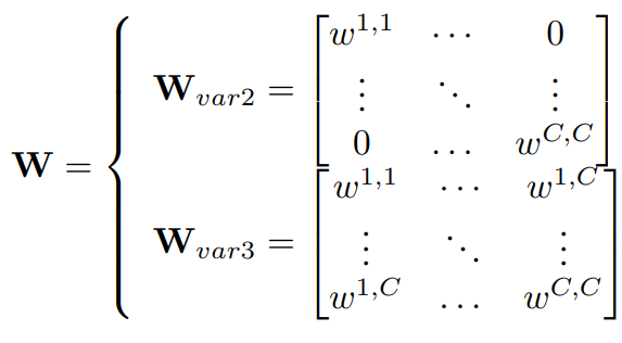 Essentially, SE-Var2 is the diagonal matrix of the complete C x C matrix and both weight matrices for SE-Var2 and SE-Var3 can be represented in the following matrix form: