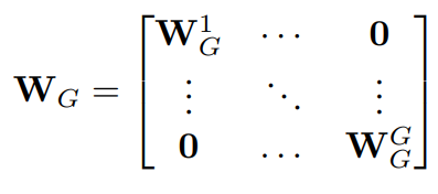 Here, the channels are divided into G groups where each group contains C/G channels and then they construct a SE-Var2 diagonal weight matrix within this group G. Thus the parameter overhead here is G which is also denoted formally as k as discussed in the earlier sections where the size of G is defined by the adaptive function ψ(C). And these G weights are shared across all strides of the 1D convolution and thus can be mathematically represented as: σ(C1Dk(y))