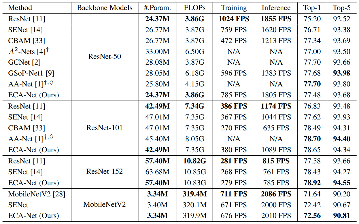 Here, we will go through the results the authors demonstrate for ECA-Net in different tasks starting from ImageNet-1k classification, object detection on MS-COCO and Instance segmentation on MS-COCO. The authors also provide additional metric of comparison like that of inference and training FPS (Frames per Second) which solidifies the efficiency of ECA-block attention as compared to other standard attention mechanisms popularly used in deep convolutional neural networks.
