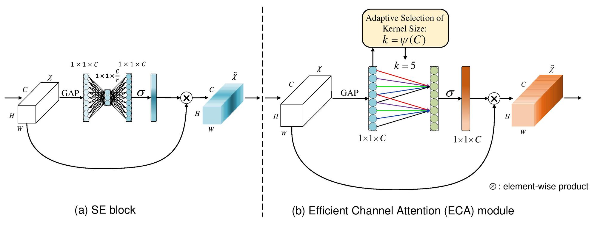 Therefore, summarizing, in ECA-block, the input tensor is first decomposed to a channel vector by passing through a Global Average Pooling layer followed by a 1D convolution with an adaptive kernel size and then passed through a sigmoid before being broadcasted and element wise multiplied with the input tensor. Thus, as compared to Squeeze-and-Excitation, ECA-Net is extremely cheap since the total number of parameters added is just k.