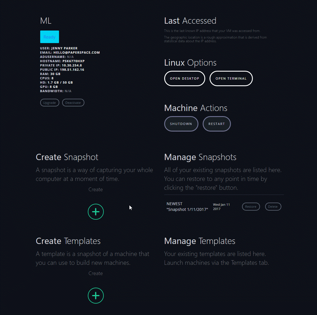 One of the most powerful features Paperspace has to offer is the ability to create an instant backup of your machine. Snapshots are a dead-simple and risk-free way to test software, or other changes on your machine, by giving you the ability to rollback in-time with the click of a button. We receive countless emails explaining how Snapshots have helped rescue broken machines, retrieve lost files, defend against malware, and generally just provide a sense of security and peace of mind.