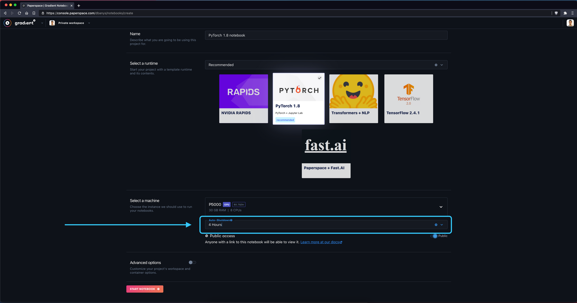 - Navigate to Gradient > Notebooks and select Create Notebook