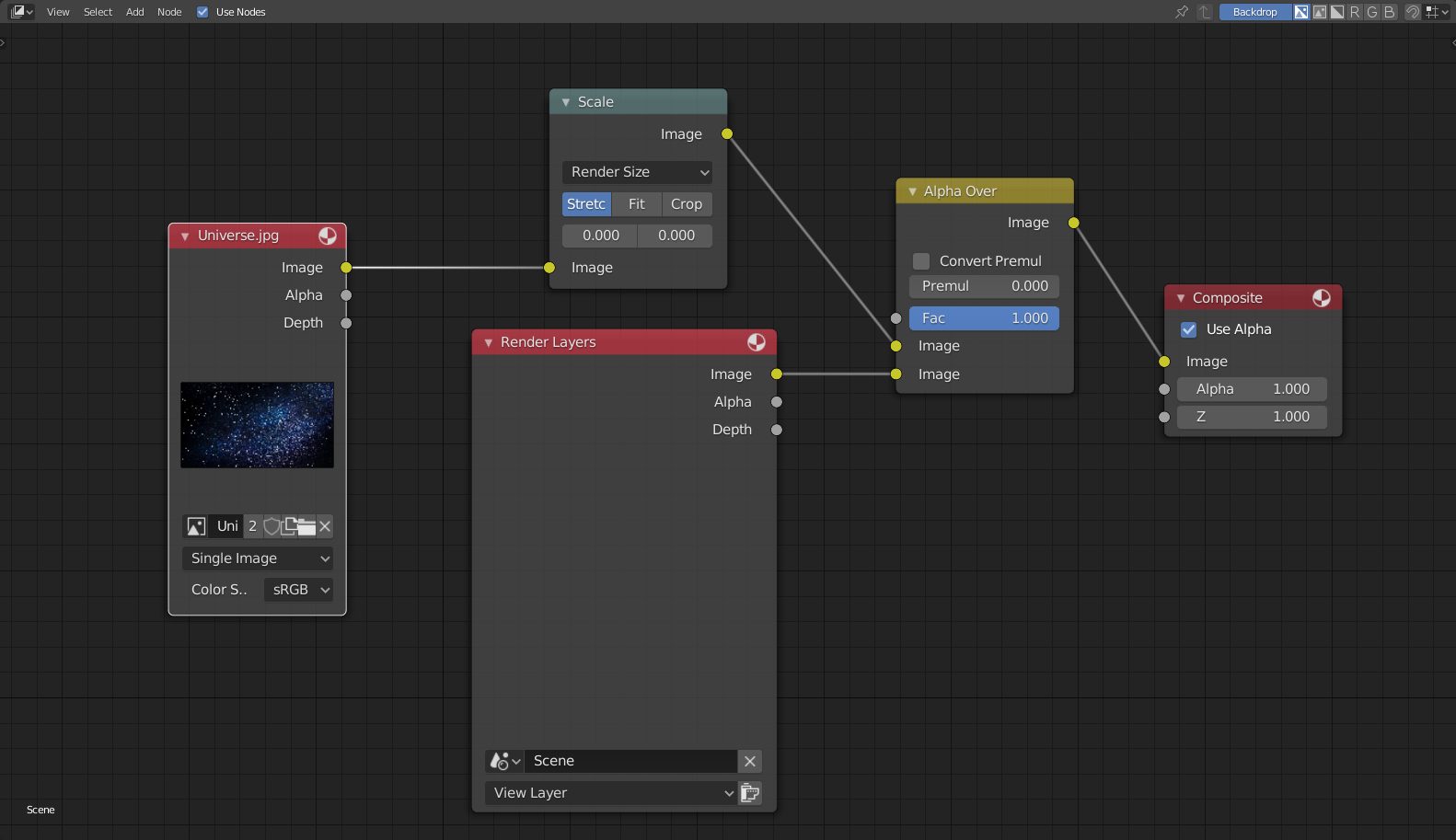 Once the input image node is added, our next task is to add the jpg image of the Universe (or any other background image that you had previously used). This step can be completed by selecting the browse image field to directly select the Universe background image or by opening it from the saved directory. Both methods should work fine, but it is preferable to follow the former rather than the latter as it directly provides you with the option of your respective image. - The next block we will add is the scaling block so that we can appropriately fit our model to the render size. For performing the following action, these are the necessary steps -