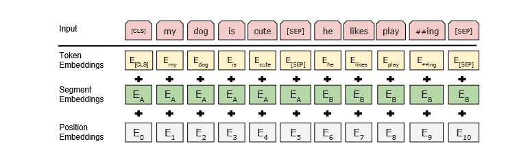 - For a given token, its input representation is constructed by summing the corresponding token, segment, and position embeddings(see the figure below).