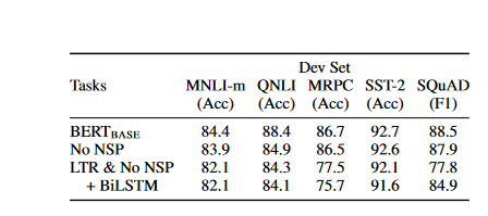 - Because the token-level hidden states in SQuAD do not include any right-side context, it is intuitively obvious that an LTR model will not perform well when making token predictions. On top of the LTR system, we tacked on a randomly initialized BiLSTM so that we could make an honest effort to improve its strength. Even though this dramatically enhances the results on SQuAD, the results are still of much lower quality than those produced by the pretrained bidirectional models. The BiLSTM hurts performance on the GLUE tasks.