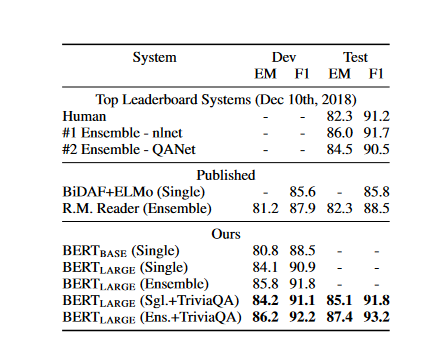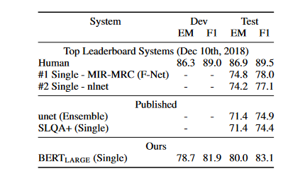 The probability space for the start and end answer span position has been expanded to include the position of the CLS token. Below is a comparison of the results to previous leaderboard entries and top published work that does not include systems that use BERT. An improvement of +5.1 F1 over the previous best system can be observed.