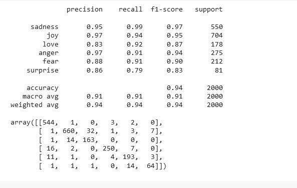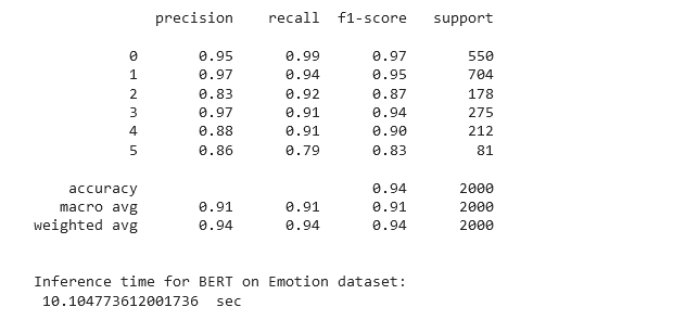 print("\nInference time for BERT on Emotion dataset: \n", (bert_validation_stop - bert_validation_start), " sec")Output: