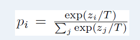Where T determines how smooth the output distribution is and zi is the model score for the class i. During training, temperature T is kept the same for the student and the teacher; however, during inference, T is set to 1 to recover a typical softmax.