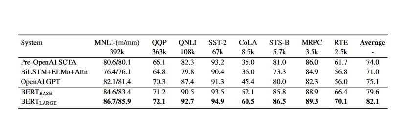 - BERTLARGE performs noticeably better than BERTBASE across the board, particularly in tasks requiring little training data.