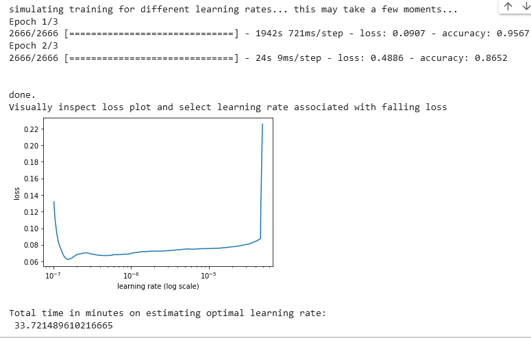 print("\nTotal time in minutes on estimating optimal learning rate: \n", (rate_bert_stop_time - rate_bert_start_time)/60)Output: