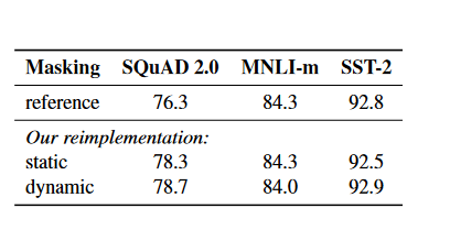 In the first BERT implementation, masking is performed only once during data preprocessing, resulting in a static mask. The authors evaluate this method against dynamic masking, in which a new masking pattern is generated each time a sequence is fed into the model. It is vital for larger datasets or for adding more steps to the pretraining process.