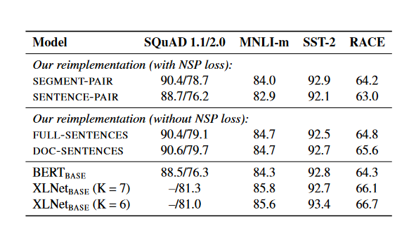 We next compare training without the NSP loss and training with blocks of text from a single document (DOC-SENTENCES). We find that this setting outperforms the originally published BERTBASE results and that removing the NSP loss matches or slightly improves downstream task performance