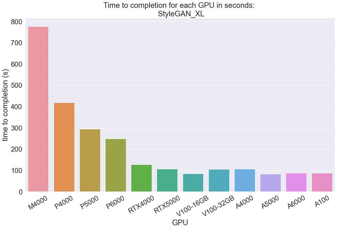 Finally, we will use StyleGAN_XL, a recently released implementation of the StyleGAN framework aimed at generating 1024 x 1024 resolution images, to benchmark image synthesis model training times. Since image synthesis is so costly, we included this to serve as a good example of how the different GPUs perform on computationally heavy tasks. Furthermore, this task will differ from the image classification task further by working with expensive high quality images for training.