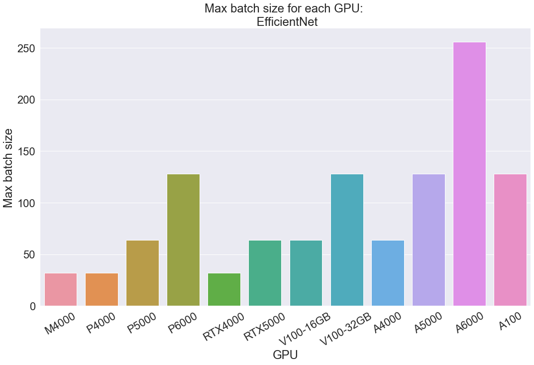 With EfficientNet, the same 3 instances we saw struggling with StyleGAN XL again reflected their relative weakness. The M4000, P4000, and RTX4000 each, with only 8 GB of memory, struggle to handle more than 32 images at this much lower resolution. After them, a new pattern emerges based on GPU memory. The more powerful Pascal P5000 and P6000 get 64 and 128 respectively, showing a clear jump with each boost in RAM. Similarly, the RTX5000 GPU can work with up to a batch size of 64. The A6000 performed the best with 256, and the P6000, 32 GB V100, A5000, and A100 tied for second with 128. Scrolling back up to our facts table, we can see that these GPUs have 24, 32, 24 and 40 GB of memory each. This likely means that processing a batch size of 256 becomes possible with somewhere between 40 and 48 GB of memory. From all of this, we can clearly infer a direct relationship between the max batch size and the GPU memory.