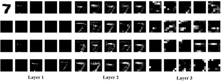 Modern machine learning methods rely on deep learning algorithms to determine the most important features of the input images. If we take the sample, number 2, and pass it through a deep convolutional neural network (DCNN), the network learns to deduce the most important features of the image. As the input data passes from the input layer to deeper layers in the network the dimensions of the image get reduced as the model picks out the most important features and stores them as feature maps that get passed from layer to layer.