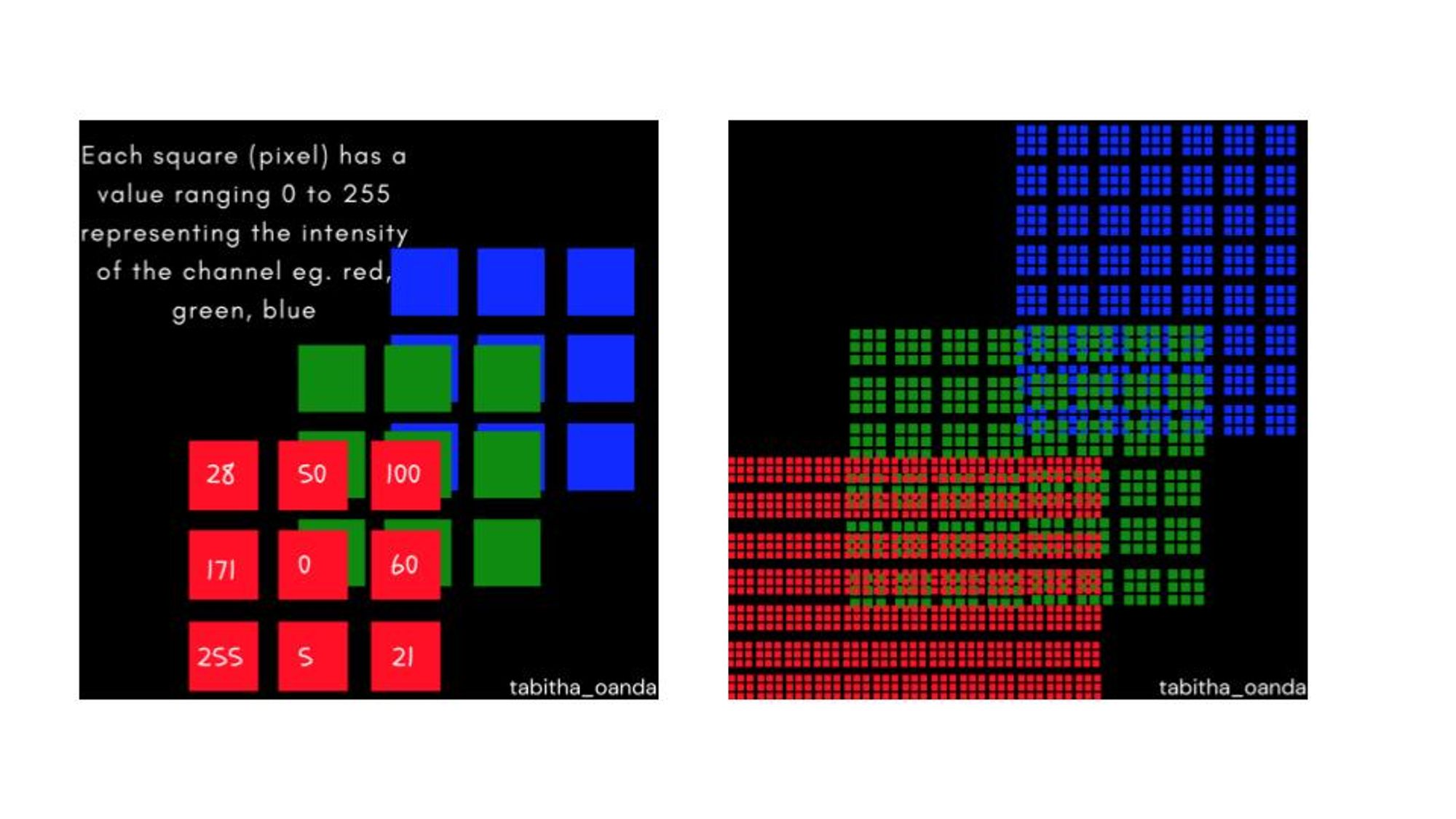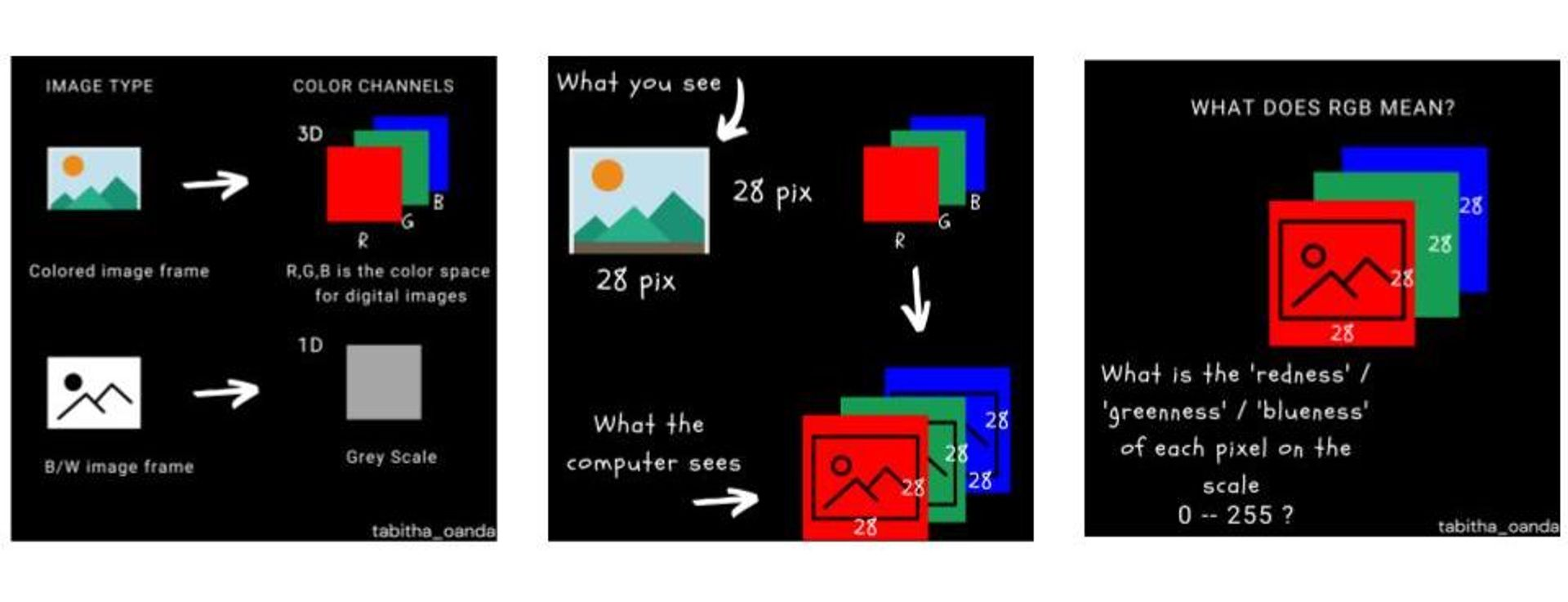 Images are matrices that contain numerical values describing pixels in those coordinates. Colorful images contain 3 color channels red, green, and blue (RGB) which means that the image is represented by 3 matrices that are concatenated. Grayscale images contain a single channel meaning the image is represented by a single matrix.