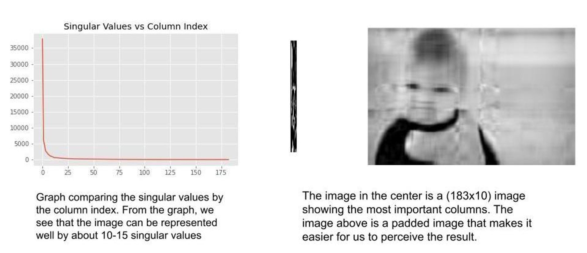 Singular Value Decomposition: To begin, we assume all the images are grayscale. This is a matrix decomposition method that reduces the matrix into 3 different matrices $U\Sigma V^T$ . $U \text{ and }V^T$ represent the vectors of the image matrix while $\Sigma$ represents the singular values. The highest singular values represent the most important columns of the image matrix. Therefore, if we want to represent the image matrix by the 20 most important values, we’ll simply recreate the image matrix from the decomposition using the 20 highest singular values. $Image = U\Sigma_{20} V^T$. Below is an example of an image represented by its 10 most important columns.
