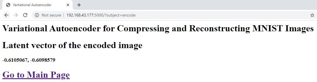 return flask.render_template("encode_result.html", num1=latent_vector[0, 0], num2 = latent_vector[0, 1])The render_template() function accepts as an argument the name of the HTML template, in addition to other arguments with their name and value listed (num1 and num2 representing the 2 values of the latent vector).